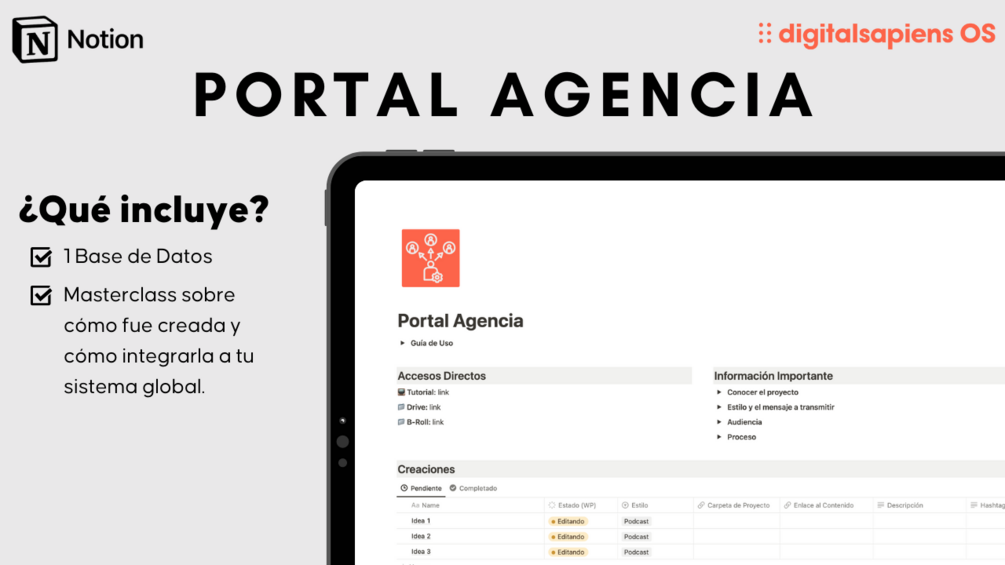 Este es un caso práctico donde se crea una Notion In App en el sistema operativo personal Digital Sapiens OS para trabajar con una Agencia de Marketing para que nos lleve la creación de contenido (videos en vertical para el caso del ejemplo).